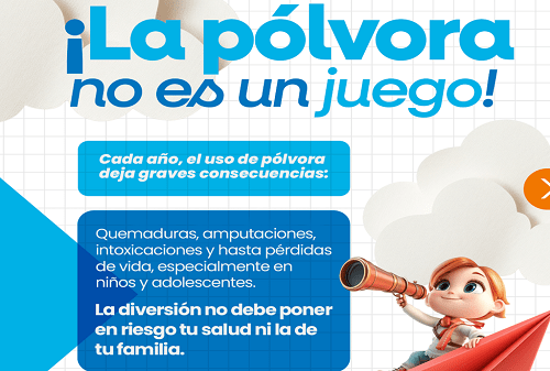 Desde la Administración Municipal, se hace el llamado a padres, madres y cuidadores para que eviten por completo la manipulación de pólvora y opten por alternativas seguras de celebración (luces, música o espectáculos autorizados). Es importante recordar que la venta y el uso de pólvora por menores de edad está estrictamente prohibida por la ley.