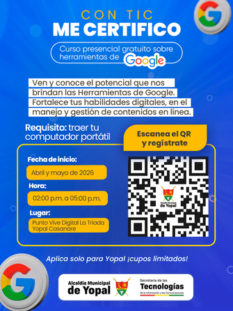 La secretaría de las tecnologías de la información y las comunicaciones de Yopal invita a la comunidad a participar en su curso gratuito “Herramientas de Google”. Esta iniciativa de formación está orientada a fortalecer las competencias digitales de los ciudadanos.