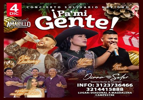 Con un marcado propósito social, se realizará este jueves 04 de diciembre el Gran Concierto Solidario Navidad Pa’ mi Gente. Este evento tiene como objetivo principal recaudar fondos para la compra de regalos navideños destinados a niños del campo y de los resguardos indígenas en los 19 municipios de Casanare.