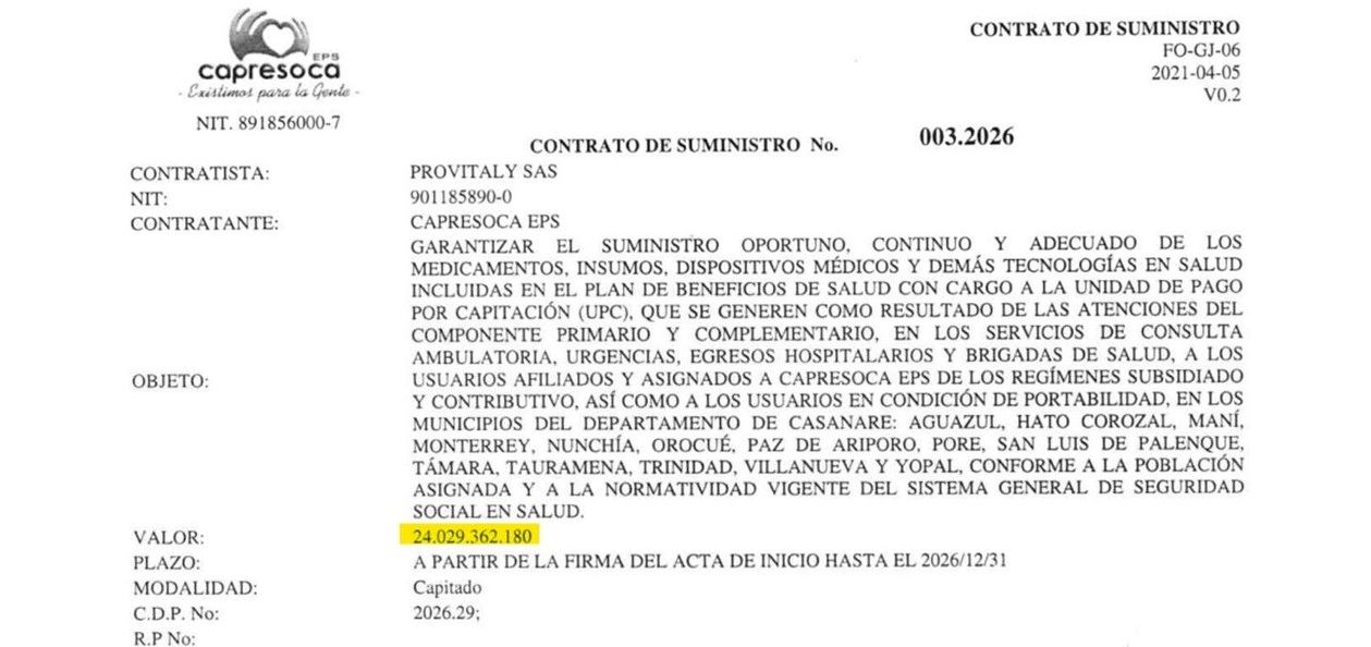 Según la denuncia, el caso más crítico corresponde al contrato 003-2026, suscrito con PROVITALY SAS por un valor cercano a los $24 mil millones de pesos para el suministro de medicamentos bajo la modalidad de cápita. Según el certificado de existencia y representación legal expedido por la Cámara de Comercio de Barranquilla, sede de PROVITALY SAS, es una microempresa constituida en 2018, con un capital autorizado y suscrito de apenas seis millones de pesos, lo que genera serios cuestionamientos sobre su capacidad financiera, técnica y operativa para ejecutar un contrato de tal magnitud en 14 municipios de Casanare.