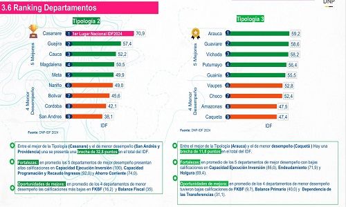 El Departamento Nacional de Planeación (DNP) dio a conocer los resultados del Índice de Desempeño Fiscal (IDF) 2024, y Casanare fue el gran protagonista al alcanzar el primer lugar a nivel nacional con un puntaje de 70,9; siendo el único departamento del país calificado como “Solvente”.