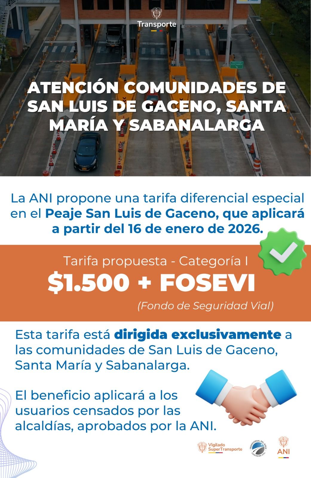 La Agencia Nacional de Infraestructura (ANI) propuso una tarifa diferencial especial para el Peaje San Luis de Gaceno, dirigida a los propietarios de vehículos que residan en los municipios de San Luis de Gaceno, Santa María y Sabanalarga. La medida, que entraría en vigencia a partir del 16 de enero de 2026, busca mitigar el impacto económico del cobro para las comunidades locales que usan de manera frecuente este corredor vial.