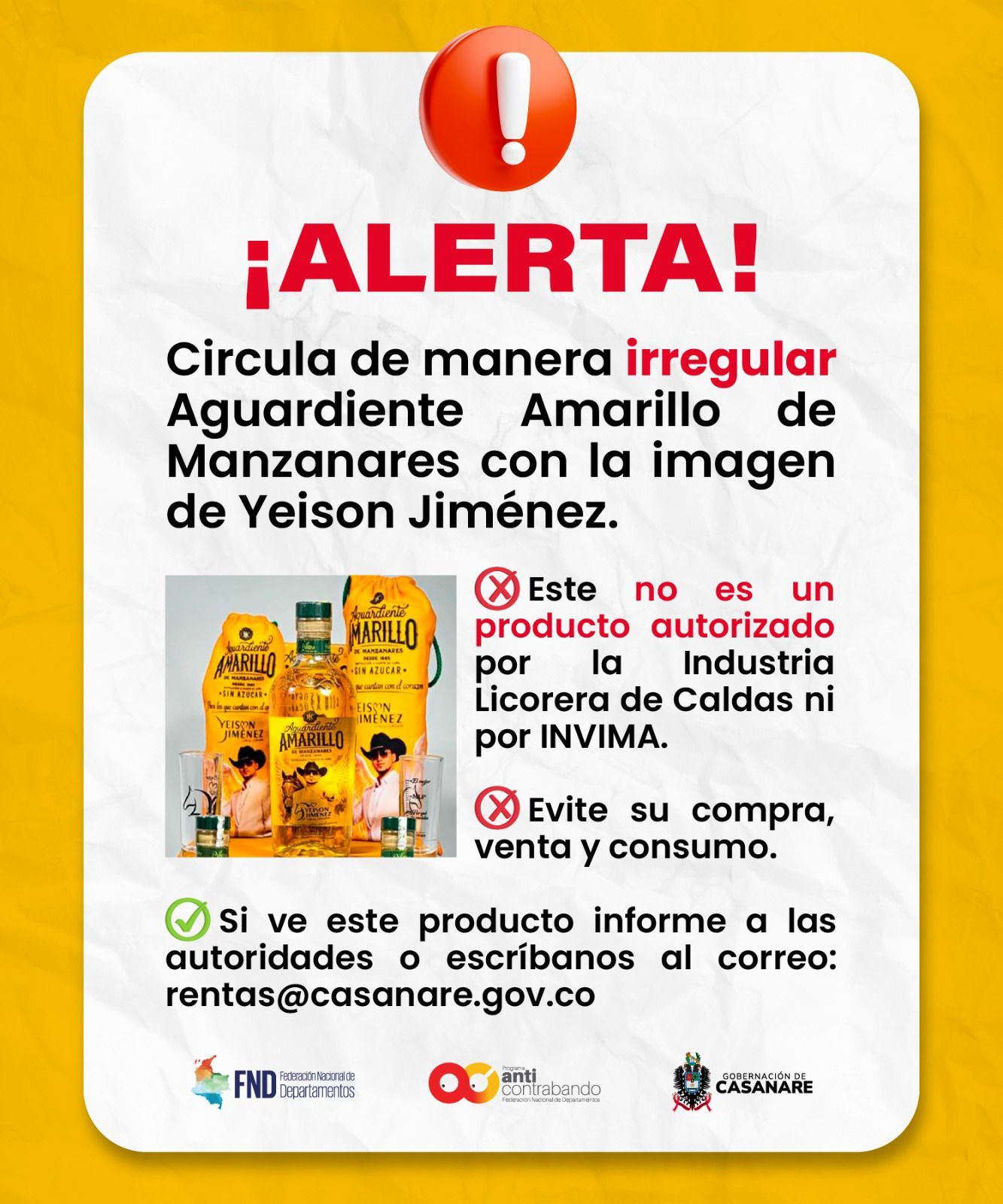 La Secretaría de Hacienda de Casanare hace un llamado urgente a la comunidad para que denuncie cualquier caso de comercialización de Aguardiente Amarillo que utilice la imagen del fallecido artista Yeison Jiménez, ya que se trata de un producto adulterado e ilegal.
