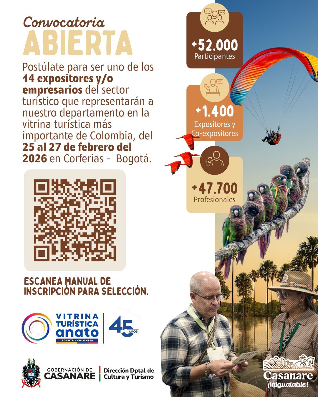 La Dirección Departamental de Cultura y Turismo abrió la convocatoria para seleccionar a catorce (14) prestadores de servicios turísticos que representarán a Casanare en la Vitrina Turística ANATO 2026, el escenario más importante del turismo en Colombia y Latinoamérica.